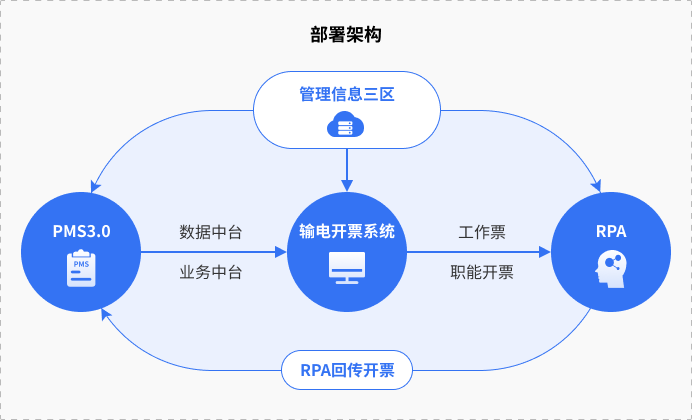 依托电网边缘云专网一体化架构进行部署,实现与内网 PMS、RPA 等核心系统的安全互联与数据互通;同时支持输电智能开票装置直连内网,构建一体化、高可靠的业务协同通道。