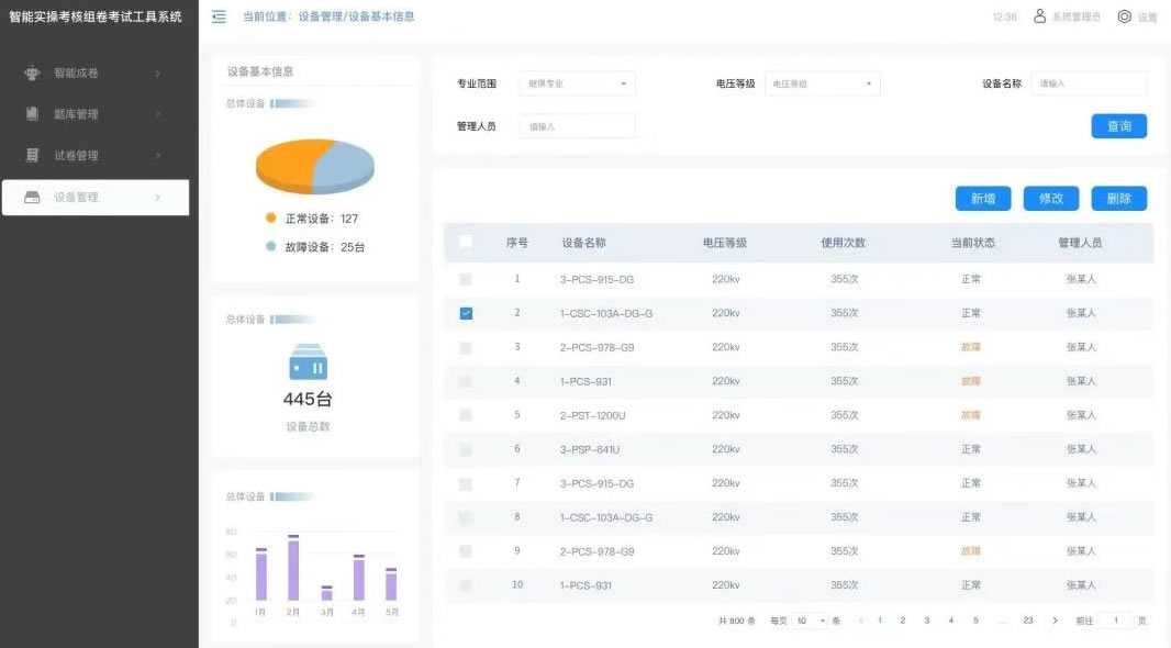 “多专业技能实操考核智能组卷考试管理系统”覆盖了继电保护专业、调度自动化专业、信通专业等多专业的技能实操考核全过程考试管理系统。该系统不仅包含了“一键抽签、现场成卷“功能,还具备设备管理、题库管理、智能成卷、考试管理、用户管理等多种功能,并且可以实现技能实操考核实验项目到故障点的多层抽签成卷,突破了以往技能实操考核故障点需要现场考评人员人工抽取及组卷的传统模式。