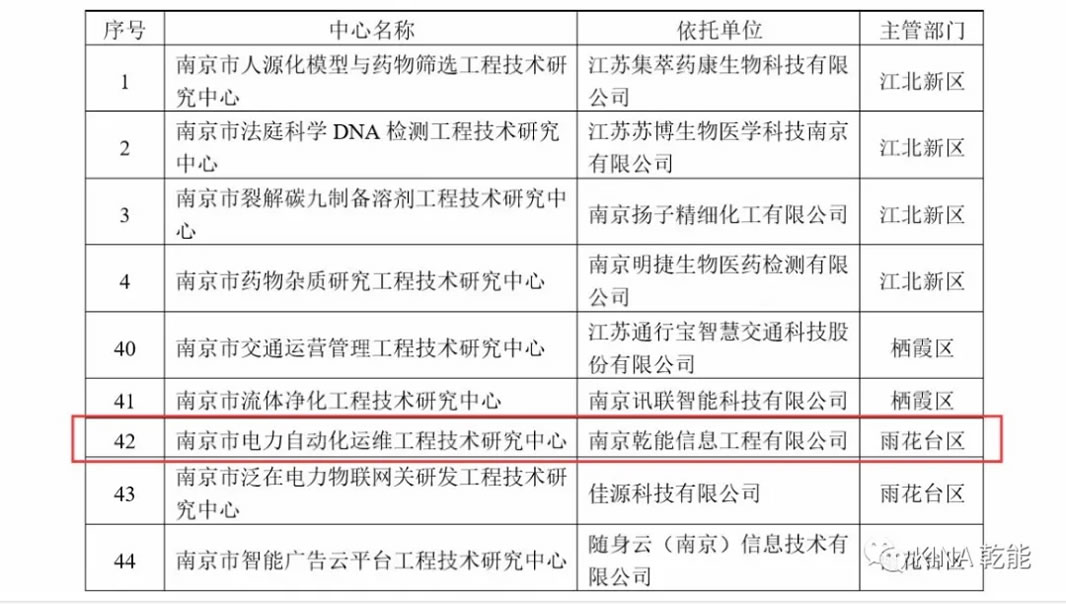 近日,根据《南京市工程技术研究中心管理办法》,南京乾能信息工程有限公司建设的“南京市电力自动化运维工程技术研究中心”经区级主管部门推荐、专家评审等程序,被授予“南京市工程技术研究中心”。