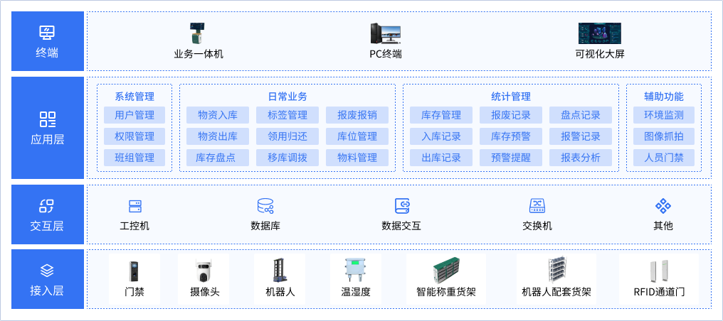 智能仓储一体化管理平台依托现有仓库改造或新仓库规划建设,以仓储建设标准化、运营管理规范化为基石,借助高新智能设备与 物联网技术,对物资进行分类管理,改进存储方式,重组信息系统,实现仓储布局的优化规划,推动 传统仓储向智能化转型,从而为企业提供更高效、精准、可靠的仓储服务。