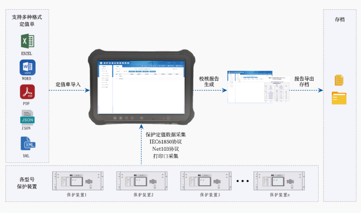 保护定值智能校核系统支持IEC-61850、NET-103、打印口等多协议通讯,实时读取装置内运行或备用区保护定值,并将读取到的定值数据保存在数据库中。
